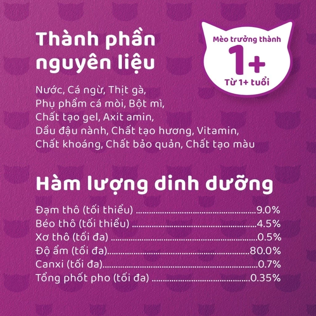– Pate cho mèo Whiskas chứa 80 kcal/100g